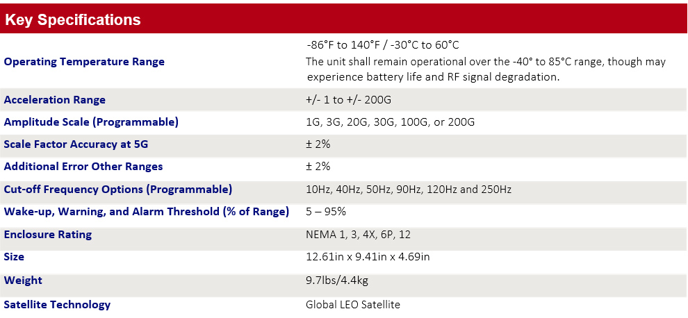 Impact Recorder and a satellite module to deliver real-time reporting of unacceptable handling conditions and asset location.